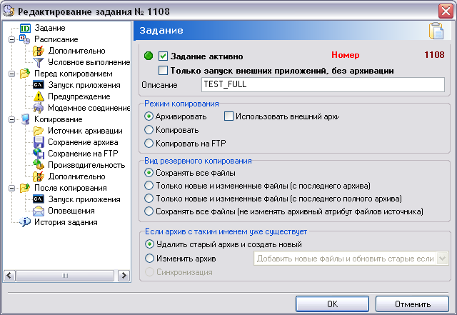 Назовем задание TEST_FULL, режим копирования: «Архивировать», Вид резервного копирования: «Сохранять все файлы»