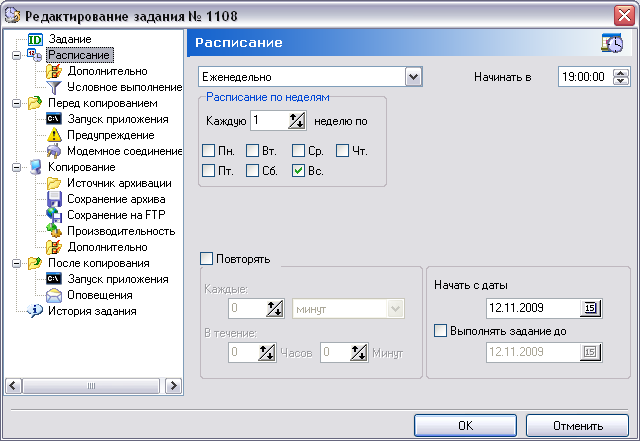 В расписании изменим дни недели выберем все дни недели кроме воскресенья, когда у нас будет происходить полное резервное копирование