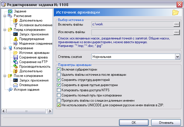 Режим копирования может быть ЛЮБОЙ, программа будет работать одинаково в любом режиме: Архивирование (возможно с использованием внешнего архиватора), копирование, копирование на FTP. В нашем примере это будет архивирование с использованием внутреннего архиватора.