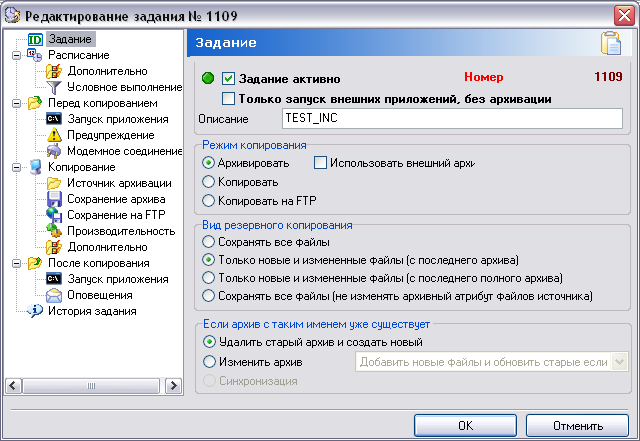 Описание: «TEST_INC», Вид резервного копирования: «Только новые и измененные файлы (с последнего архива)». Это как раз инкрементальный режим резервного копирования. Для выбора дифференциального режима необходимо выбрать режим копирования: «Только новые и измененные файлы (с последнего полного архива)»