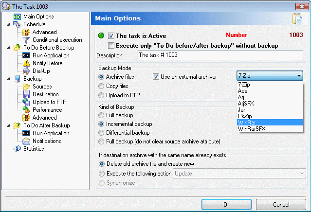 Так же программа позволяет подключить для выполнения задания любой внешний архиватор.